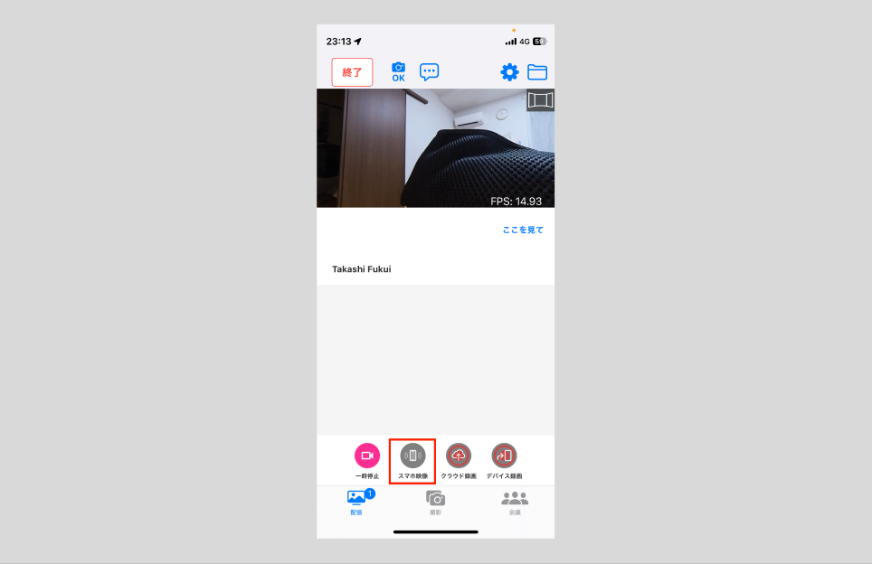 配信画面で、[スマホ映像]ボタンを押して配信開始(もう一度押すと配信終了)