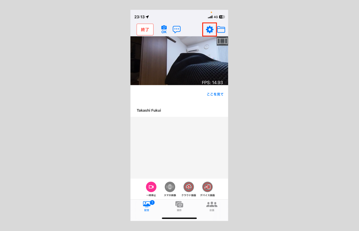 - 配信画面右上の歯車マークを押して設定画面に進む
