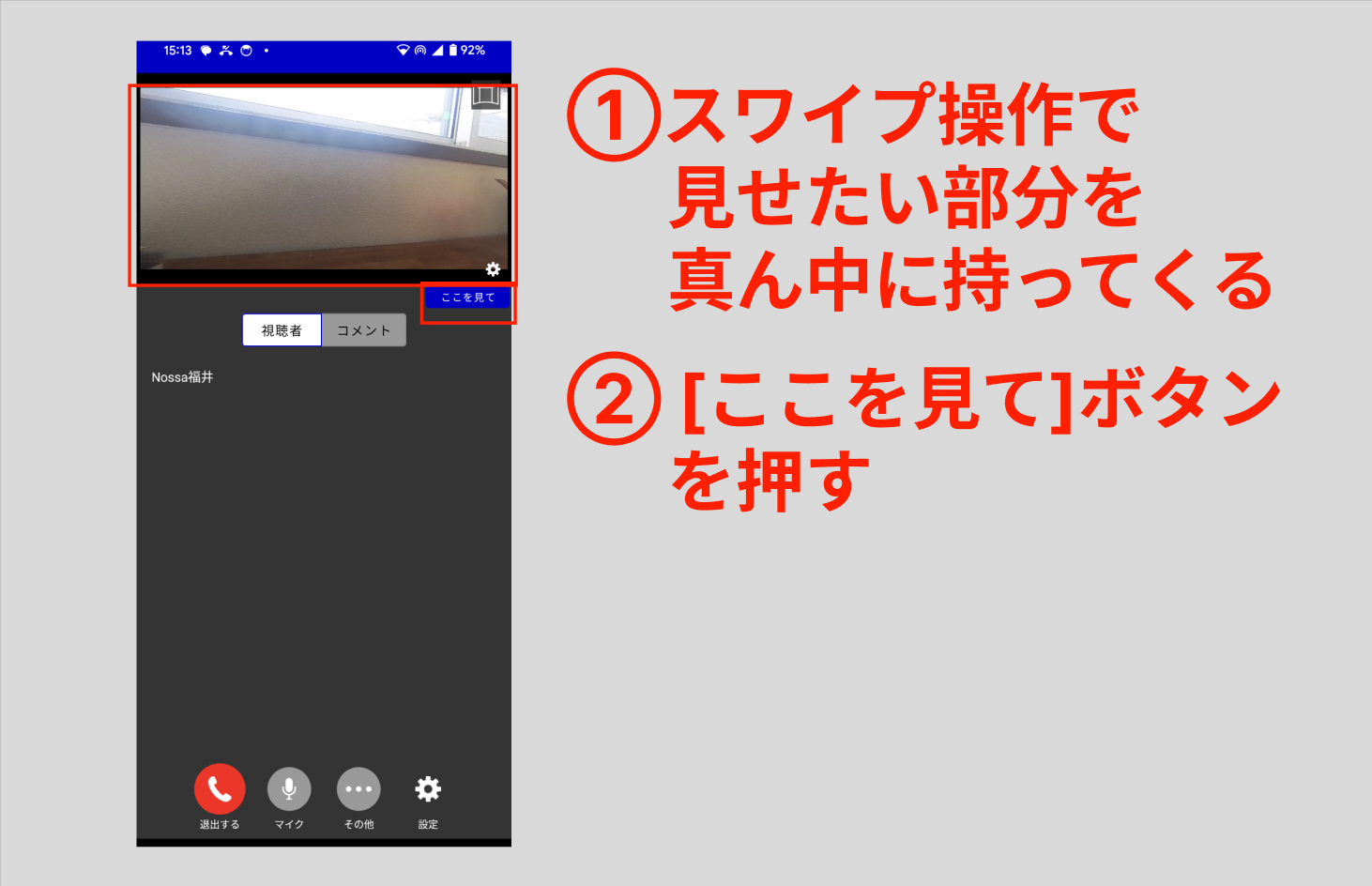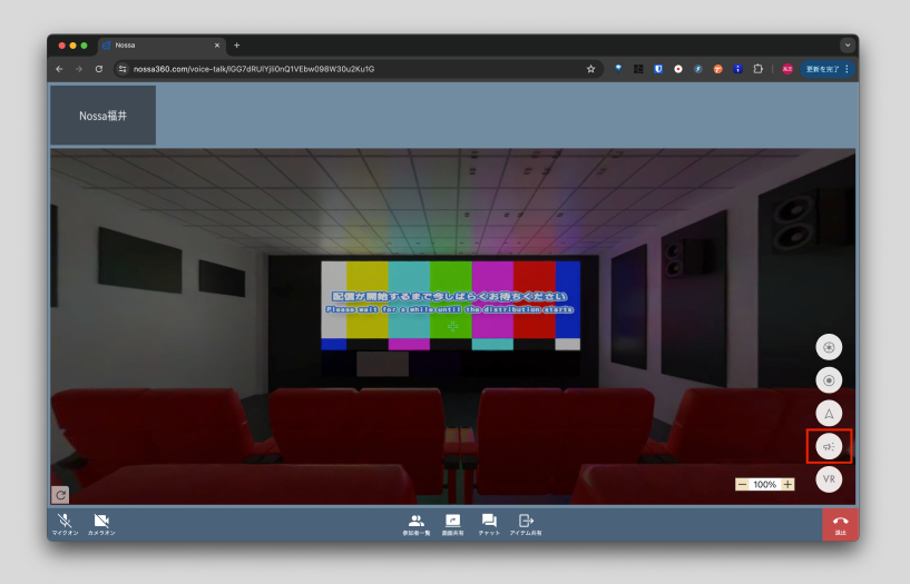 - 360度映像を、各閲覧者が自由にグリグリと見回せるのがNossa360の特徴の1つですが、何かを説明するときなどに、同じものを見ながら話をしたい、特定の部分を見てもらいたい、といった場合があるかと思います。そのようなときに使えるのが、「ここを見て」機能です