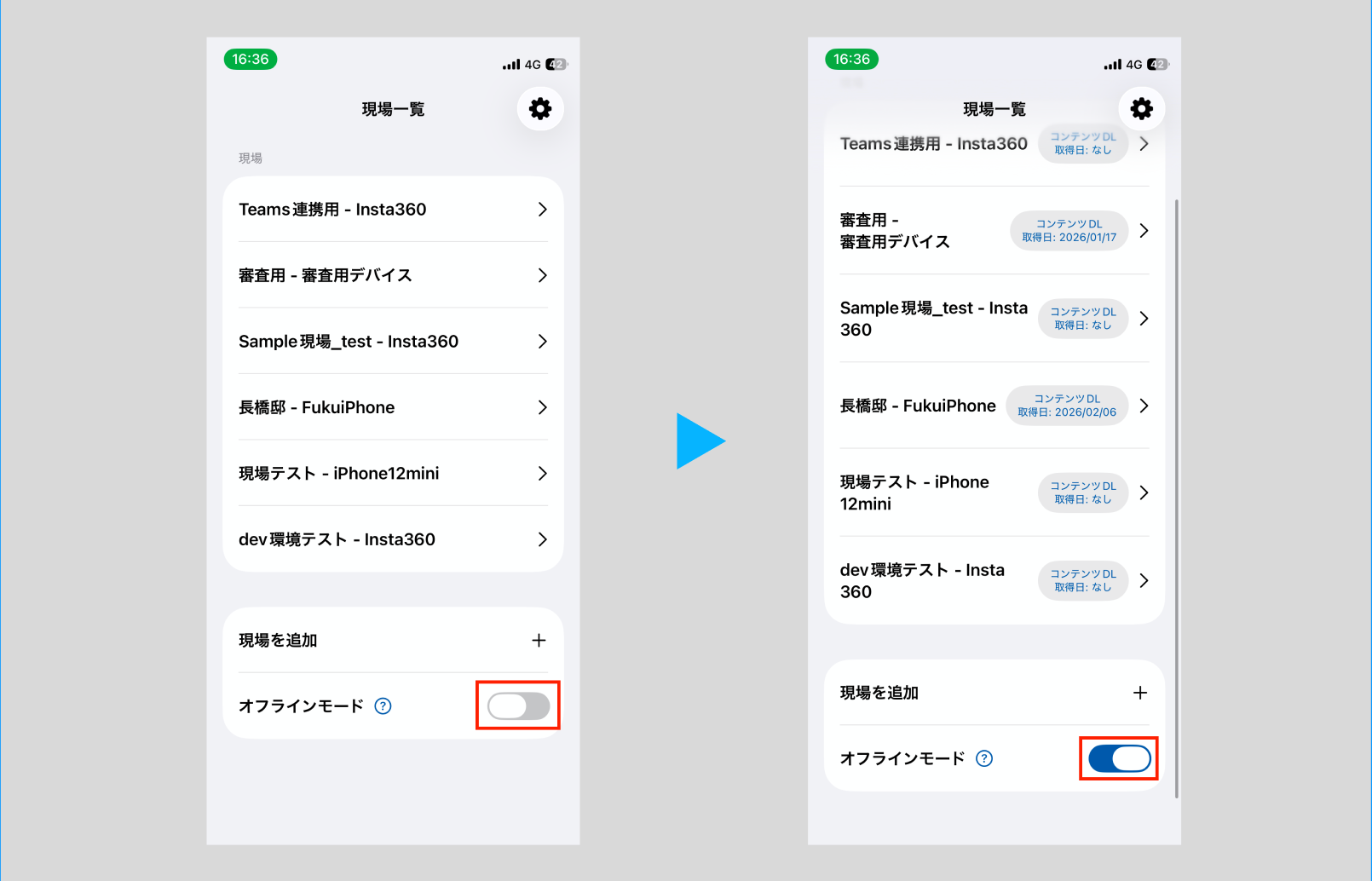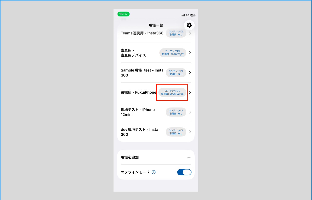 - 「現場一覧」画面の最下部にある「オフラインモード」のスイッチをONにしてください