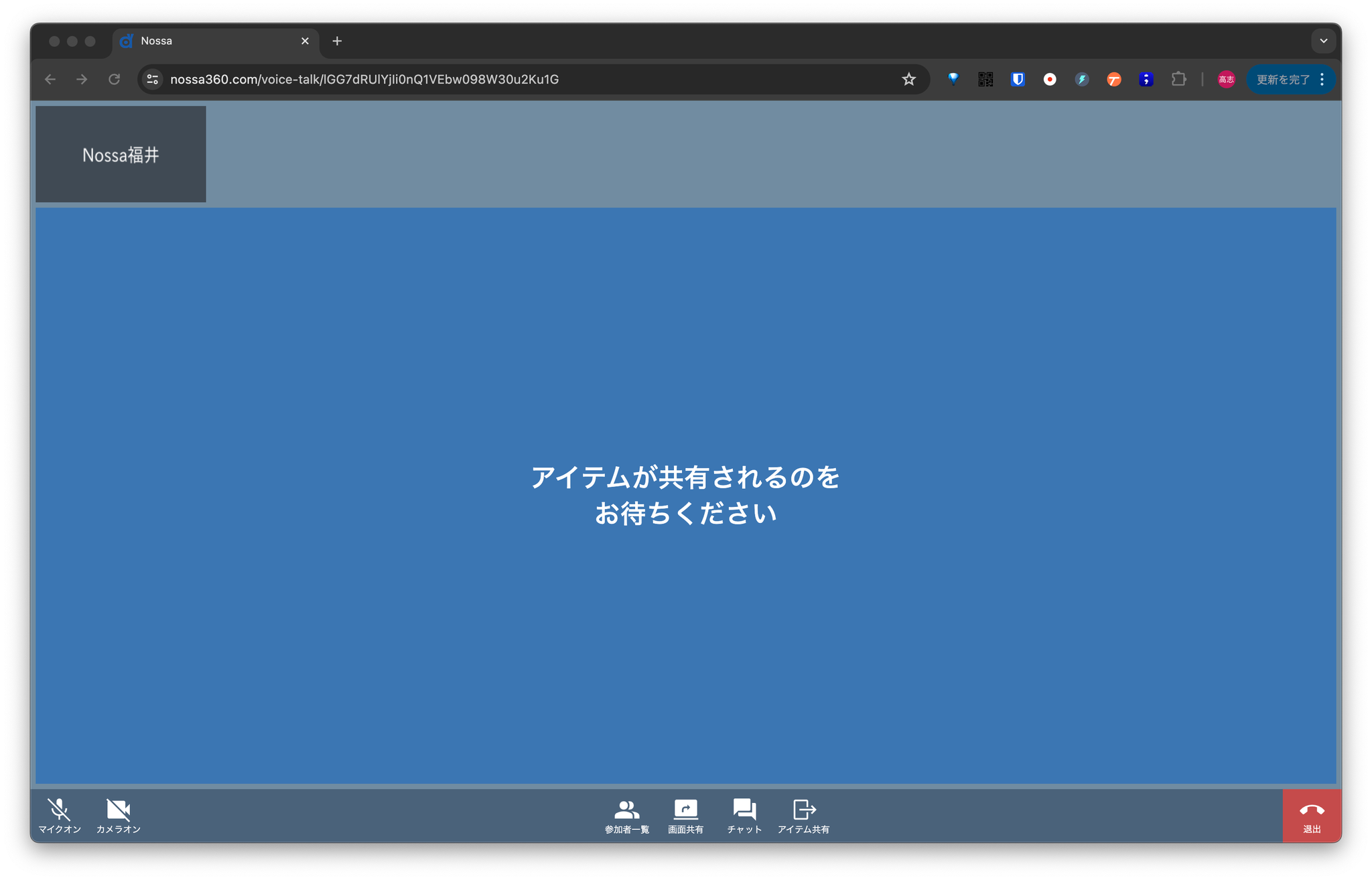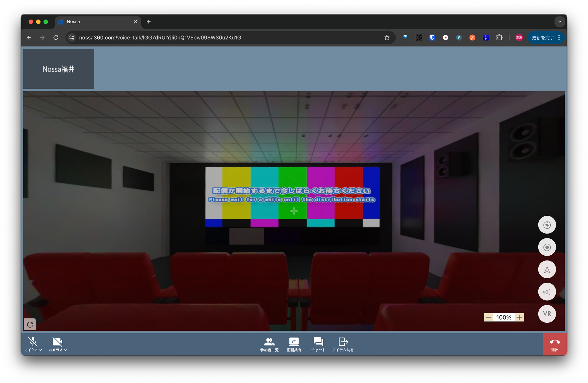 - 以下の画面が表示されたら、入室完了。主催者が共有対象ファイルを選択すると、その動画像が表示される。(Insta360の場合、配信を開始すると自動で映像が表示されますが、THETA/Labpanoの場合は、主催者側で対象端末を「このアイテムをシェア」する必要があります)