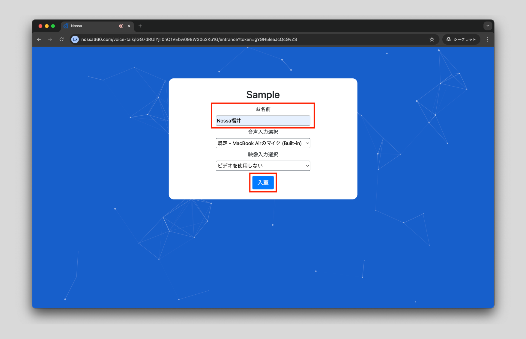- 「お名前」を入力し(他参加者に表示されるあなたの参加者名です)、[入室] を押す
