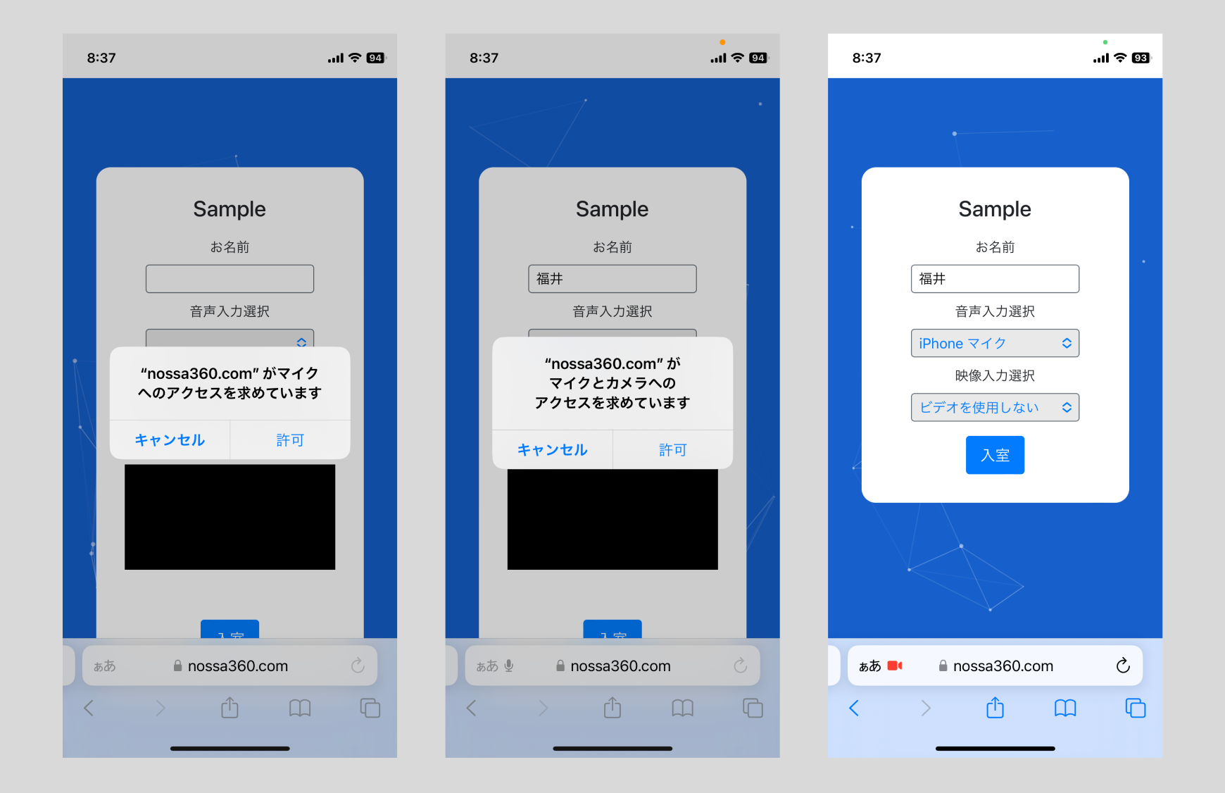 - 「お名前」「音声入力選択」「映像入力選択」をして、[入室] を押す
