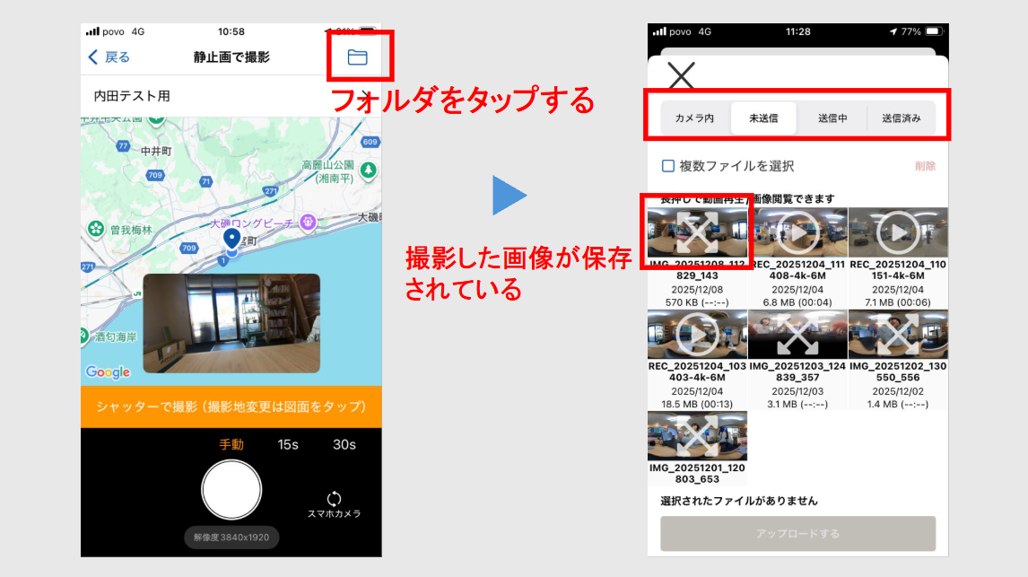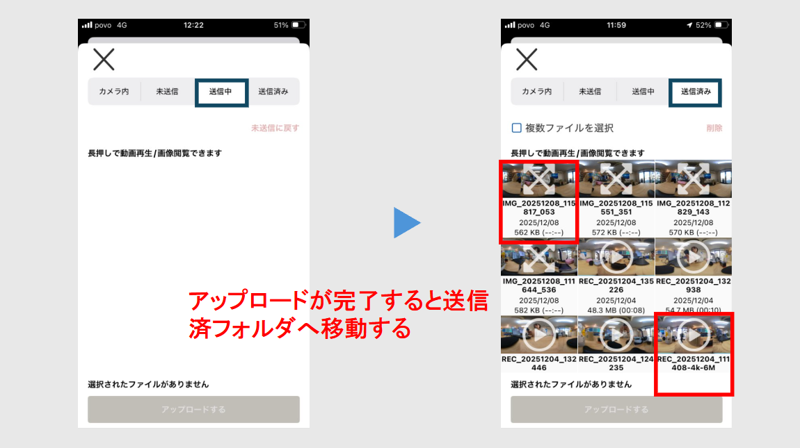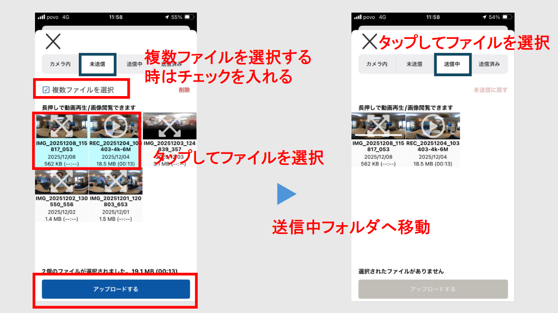 アップロードするをタップすると選択したデータは送信中フォルダへ移動する
