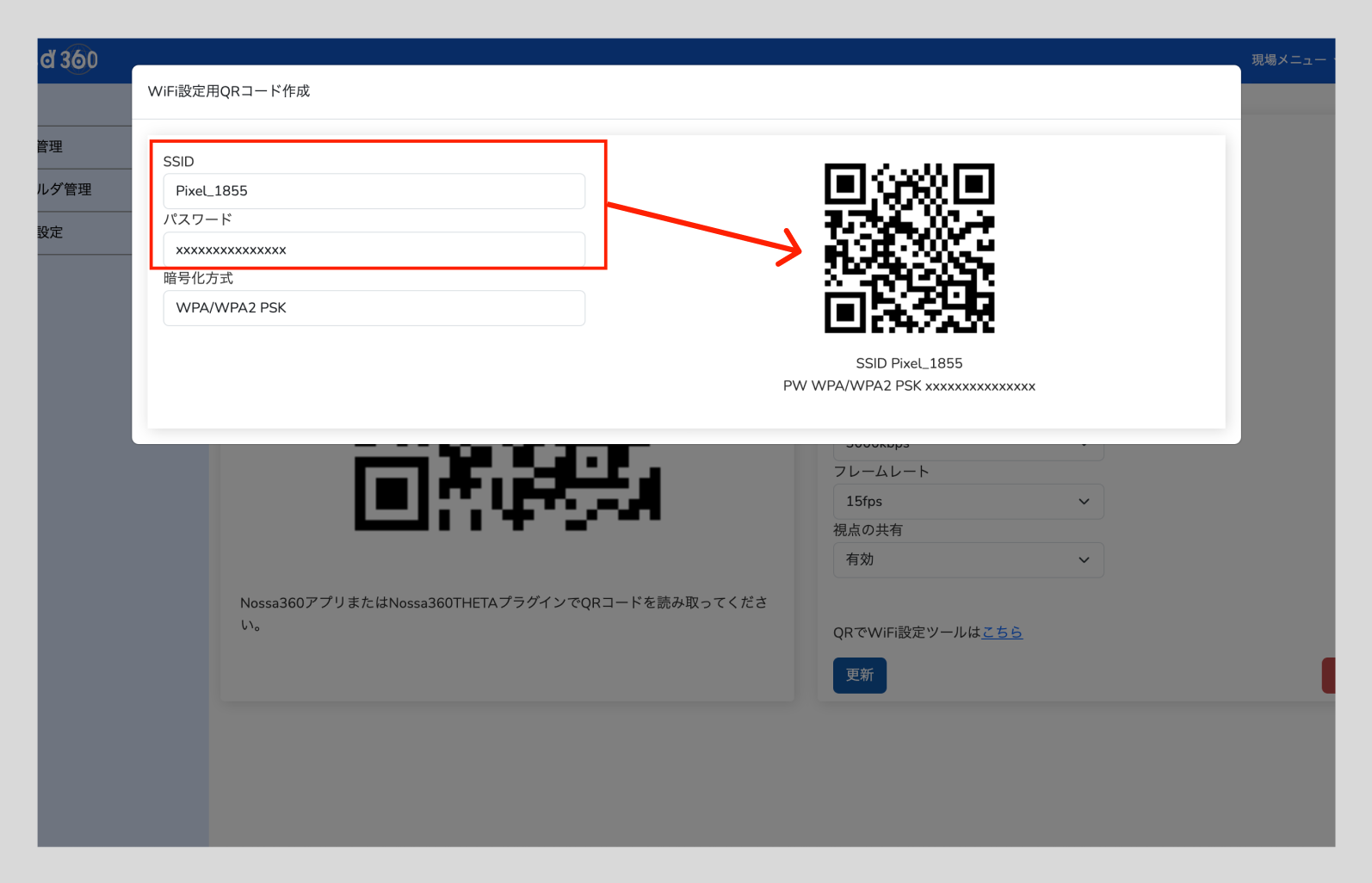 - 接続したいWiFiのSSIDとパスワードを入力する→QRコードが自動生成される