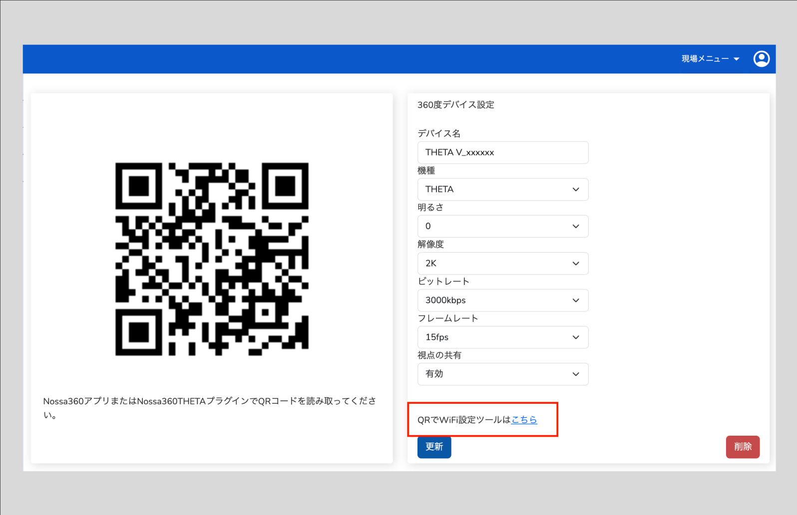 - WebブラウザでNossa360(https://nossa360.com/login)にアクセスし、現場選択→現場メニューから端末設定を選択→THETA端末の[詳細]を押す