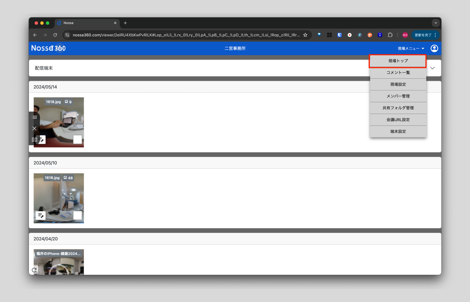 - ホーム画面(https://nossa360.com/home)で、利用する現場を選択する