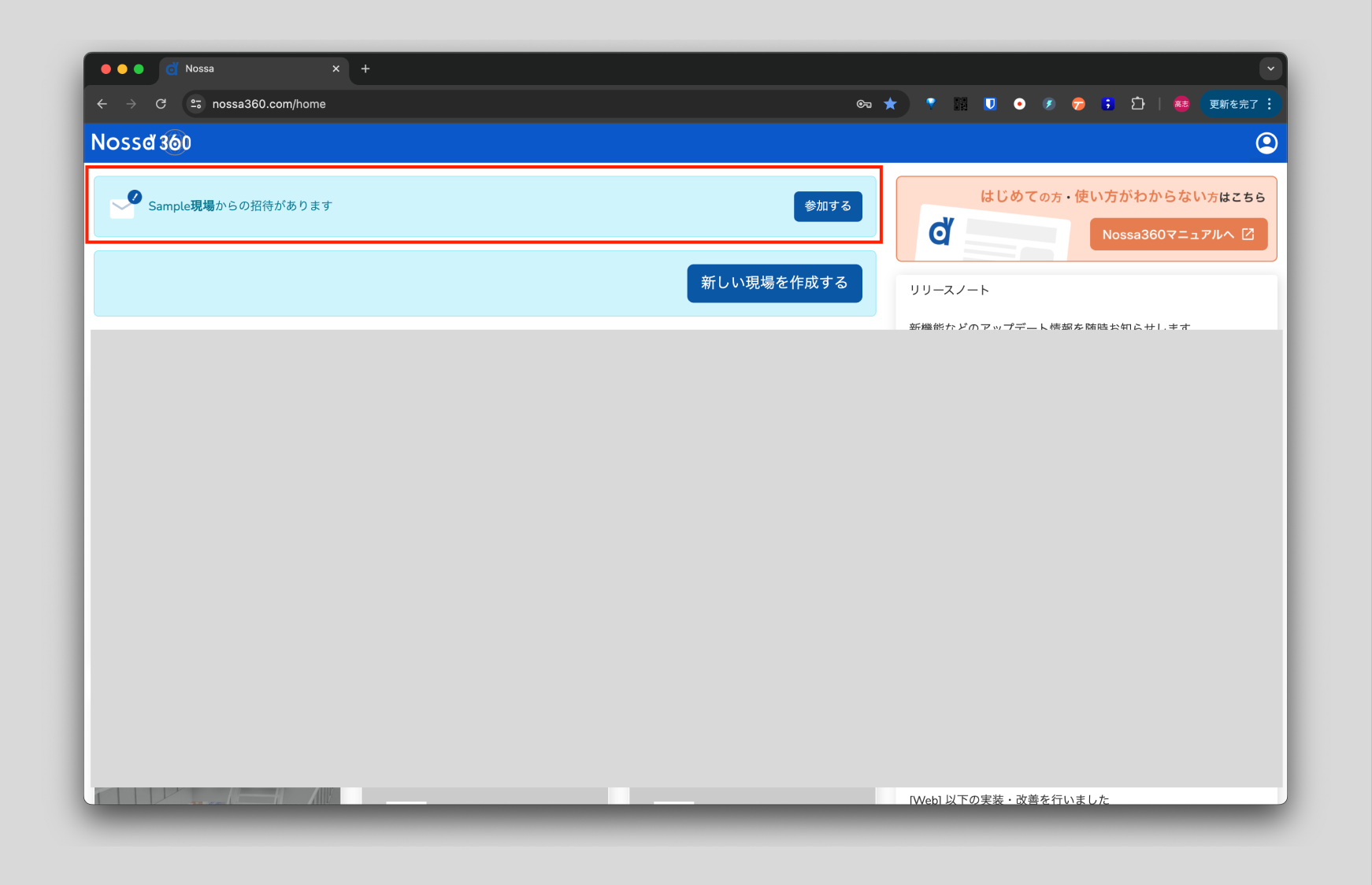 - ログイン後のホーム画面(https://nossa360.com/home)の上部に表示される、招待メッセージの[参加する]を押す