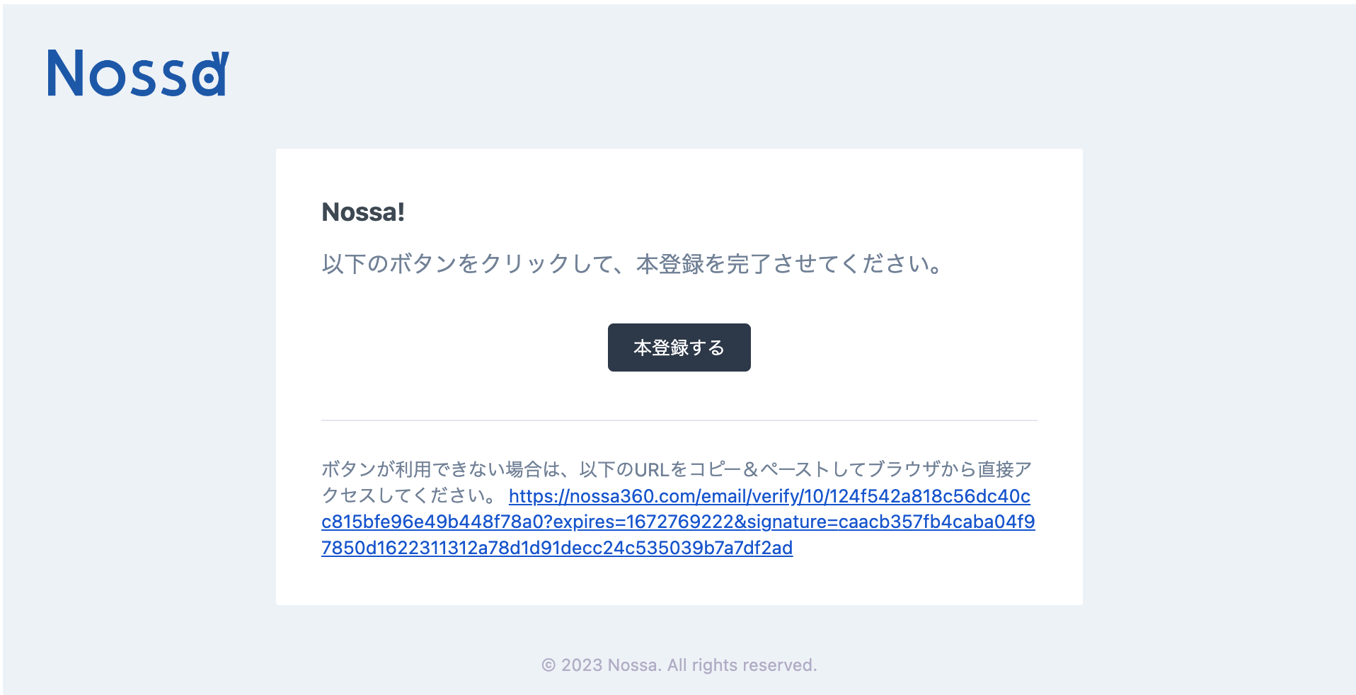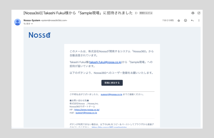 - メール内の[現場に参加する]ボタンを押す。または、リンク(https://nossa360.com/register)にアクセスする
